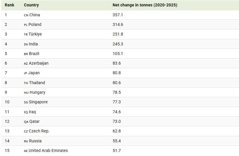 Poland followed China closely in the ranking, increasing its gold holdings by over 300 tonnes as part of a long-term push to bolster monetary security.