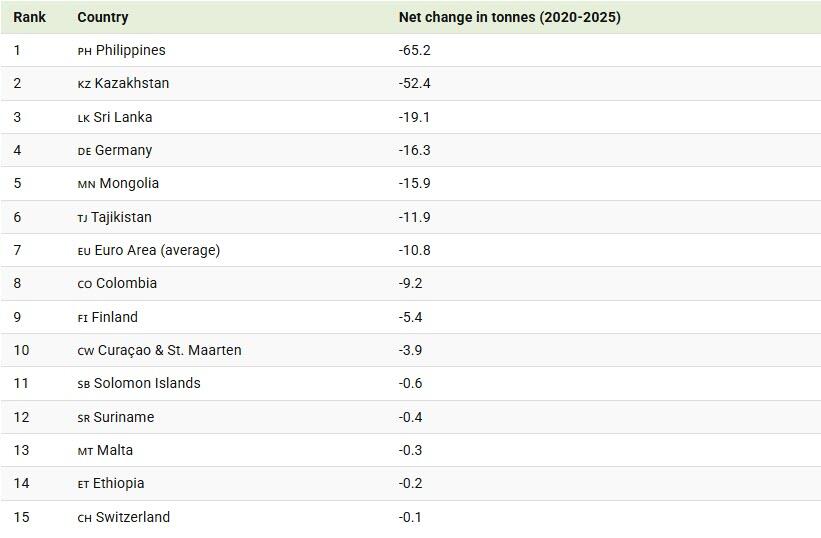 The Philippines recorded the largest reduction, cutting reserves by more than 65 tonnes. Kazakhstan and Sri Lanka also posted significant declines, often reflecting domestic liquidity pressures or active reserve rebalancing during periods of economic stress.