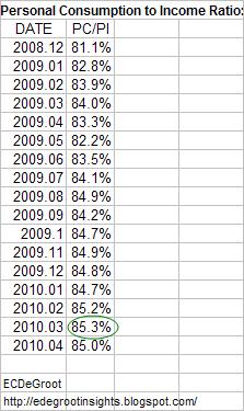 The personal consumption to income ratio remains above 85%. A society based on excessive consumption with little investment is not sustainable. When wealth created from previous productive endeavors is consumed or transferred, society is left with obligations that it cannot pay.